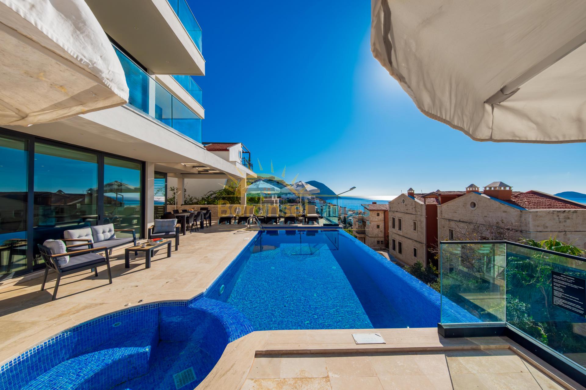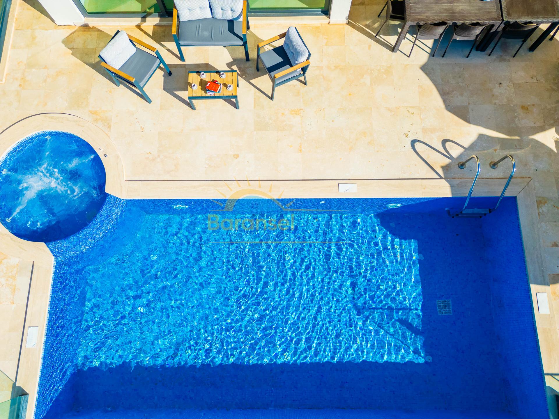 The pool terrace has an infinity pool with integrated outdoor round jacuzzi. There is plenty space for sunbathing, a shaded outdoor dining area and BBQ so guests can enjoy leisurely days under the sun.