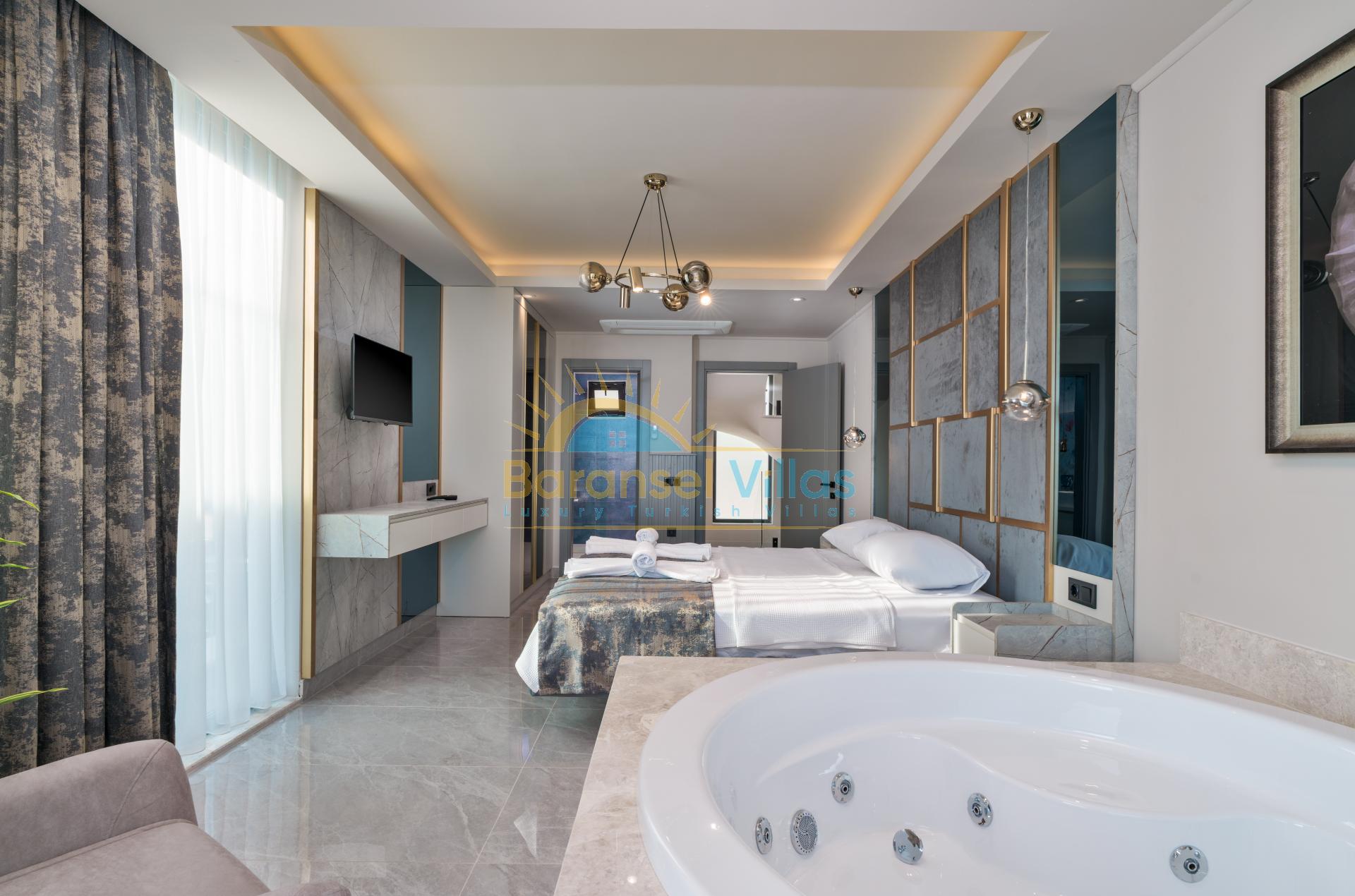 Details: Double bed, nightstand, air conditioning, wardrobe, dressing table, cot, bathroom, TV, jacuzzi, and access to the balcony.