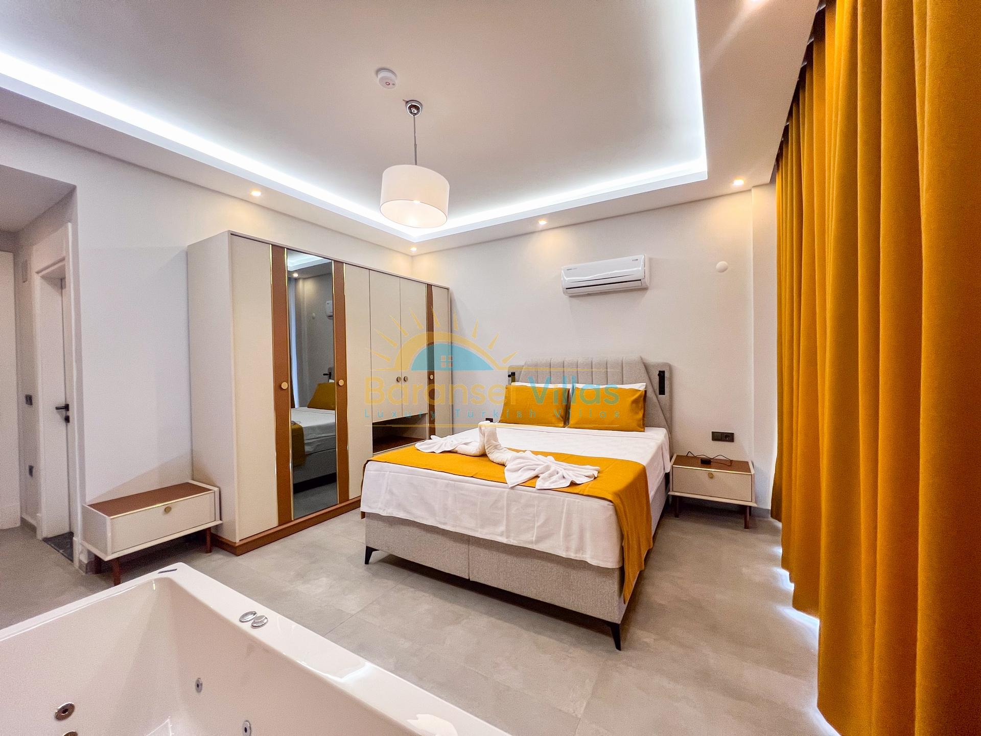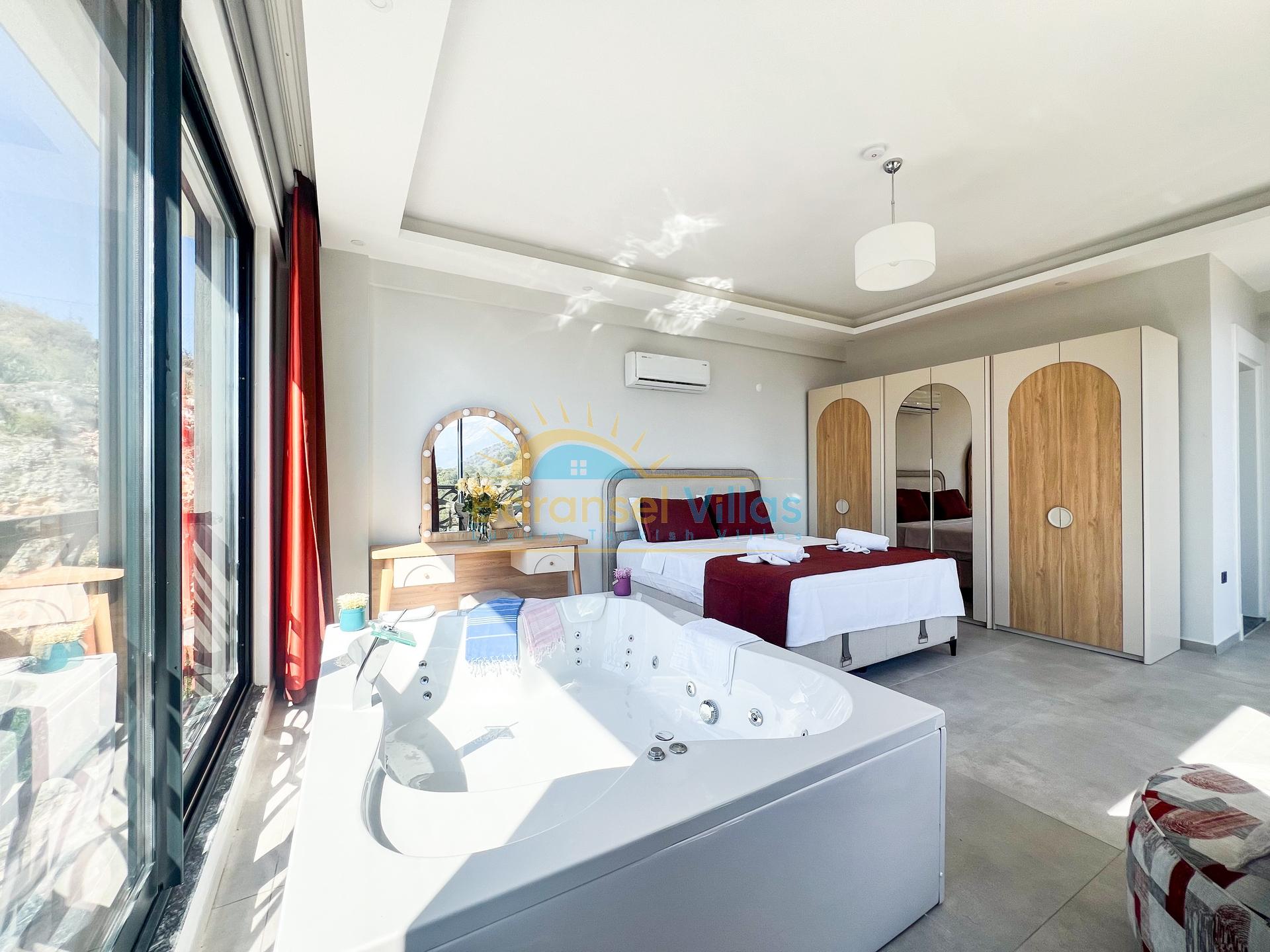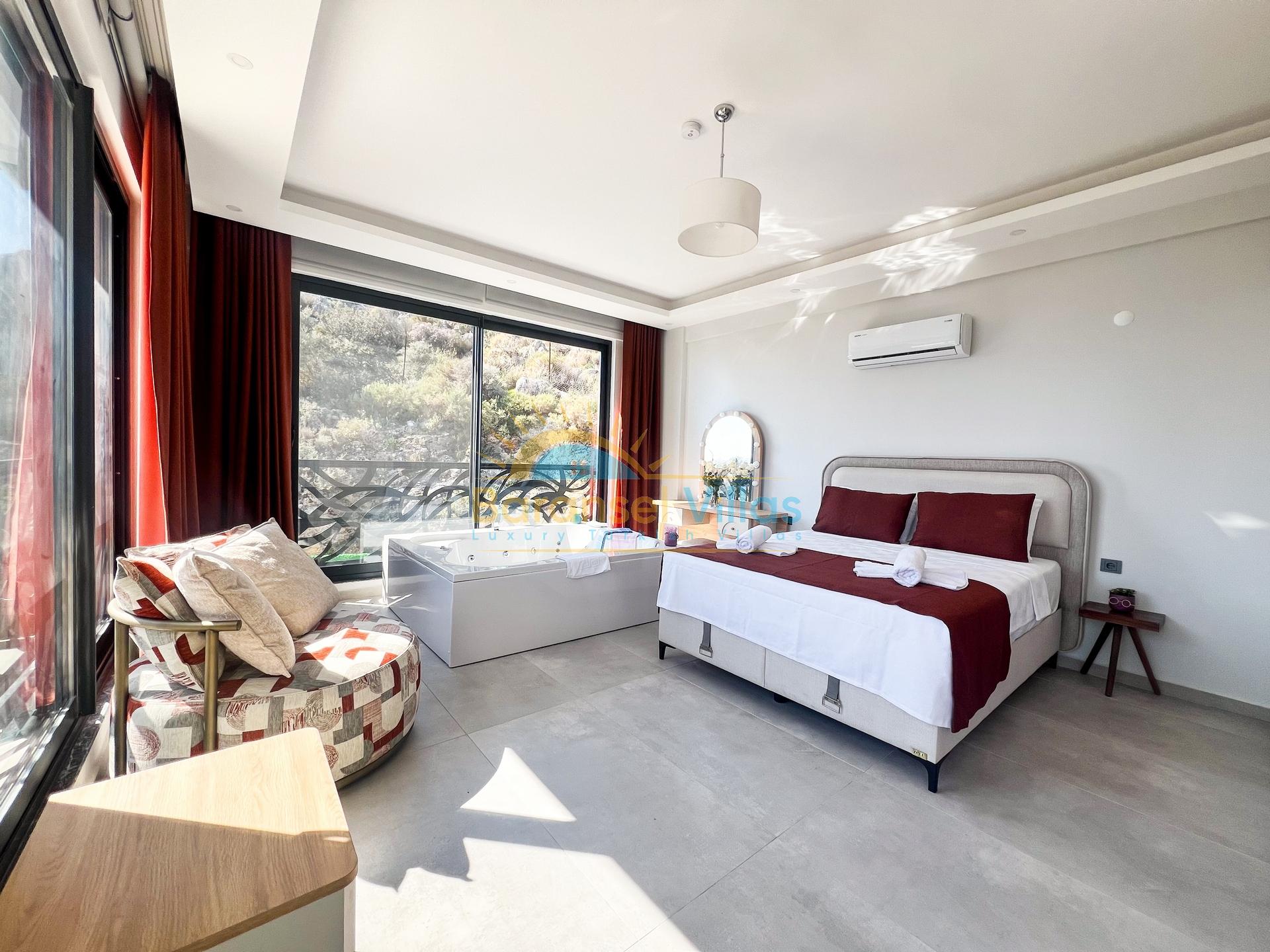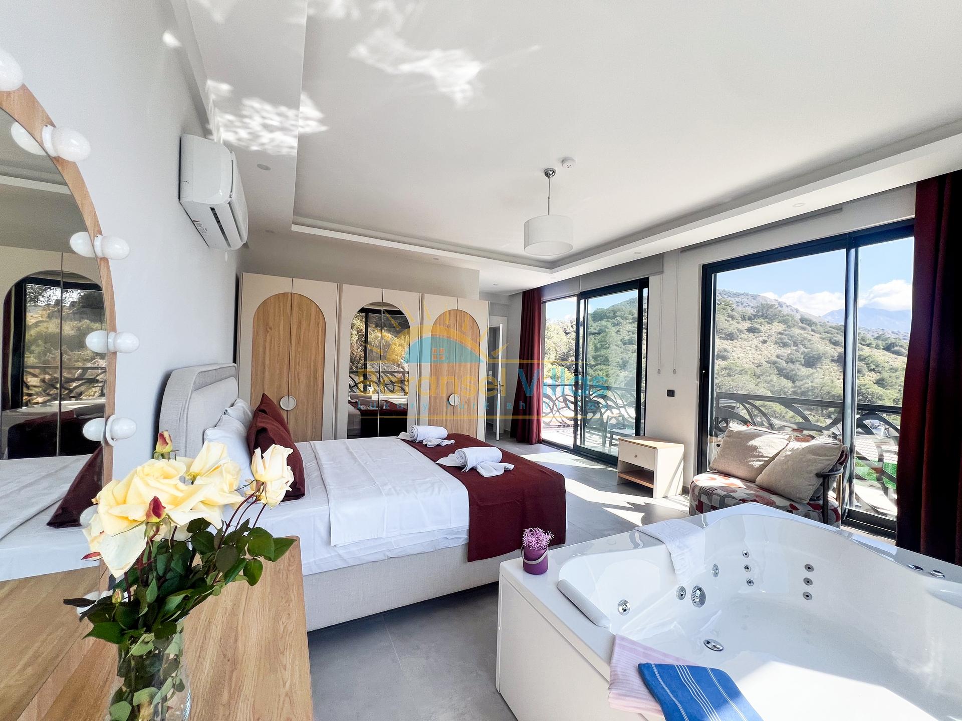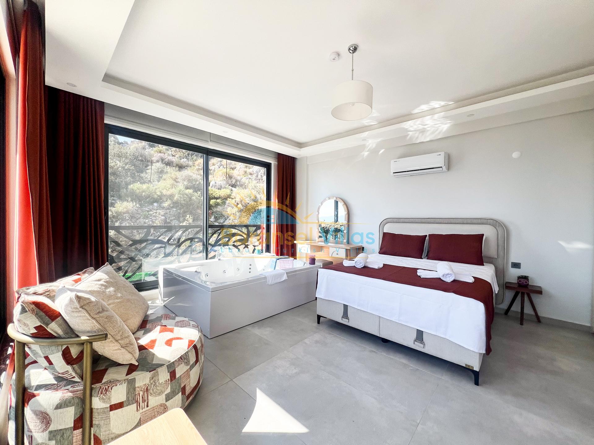 Details: Double bed, bedside table, wardrobe, jacuzzi, air conditioning, bathroom, and balcony.