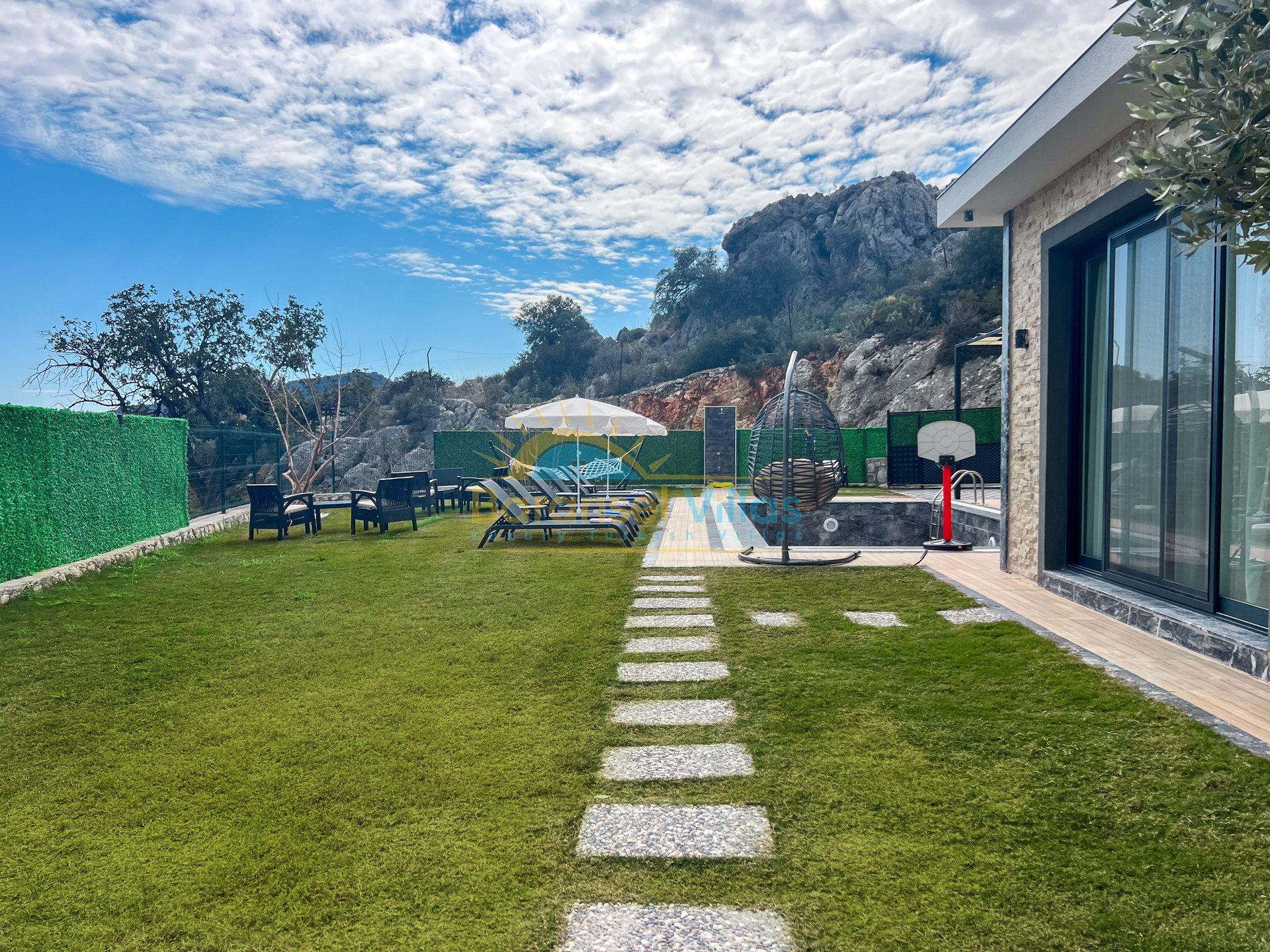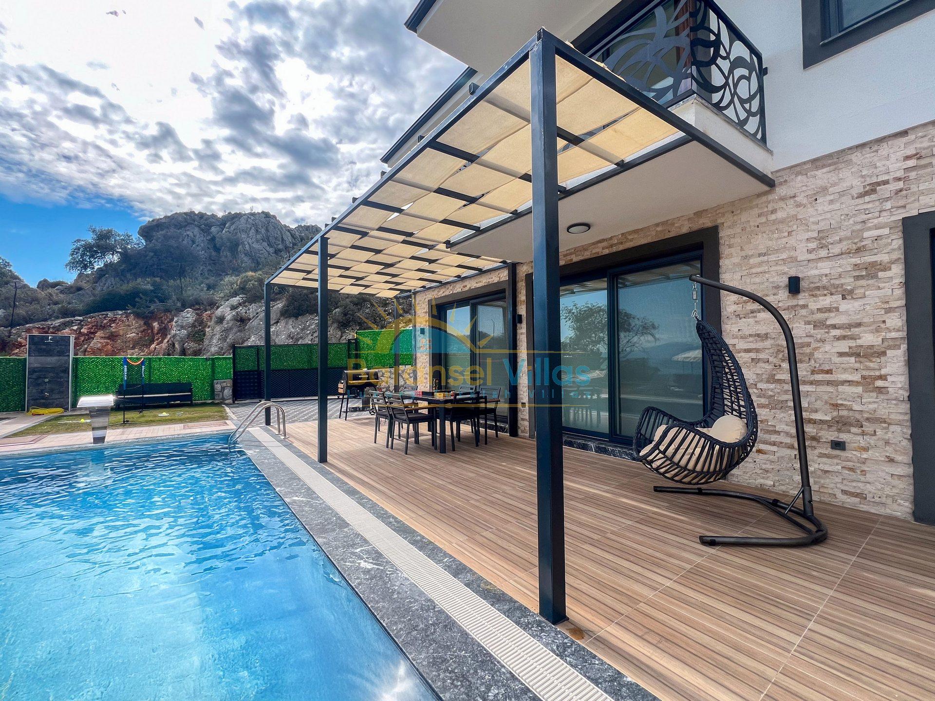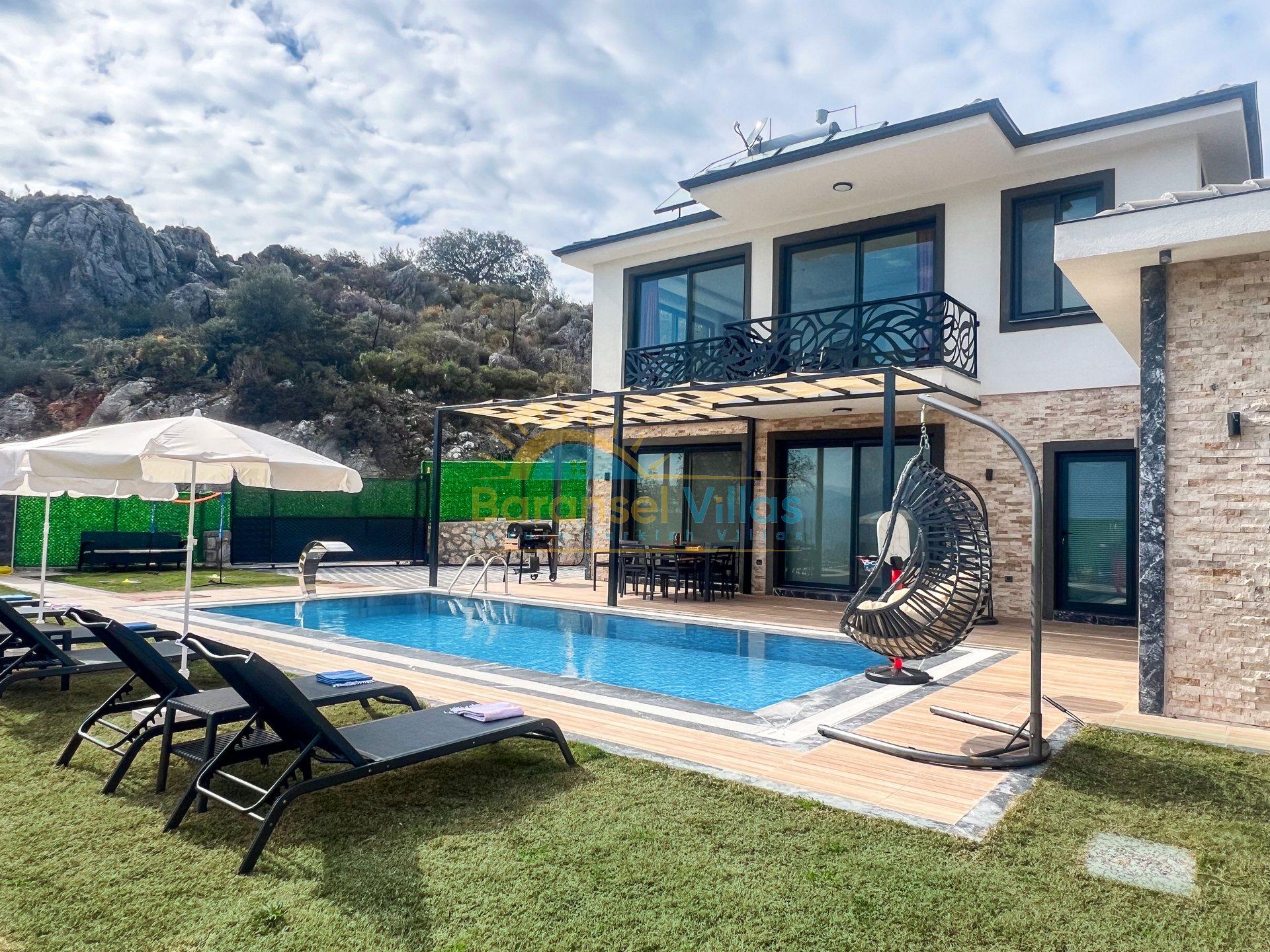 Villa Milena is a luxurious villa located in KayaKöy, Fethiye; one of the world-famous holiday destinations. Situated in a very special location, it blends seamlessly with the blue and green of the sea, showcasing its modern and striking appearance. Its infinity pool and exquisite sea views create a captivating effect. Located in a quiet and peaceful setting, surrounded by nature, this villa offers an unforgettable holiday away from prying eyes. Decorated with high-quality and stylish furnishings within a spacious garden, the villa accommodates up to 6 people in 3 bedrooms.