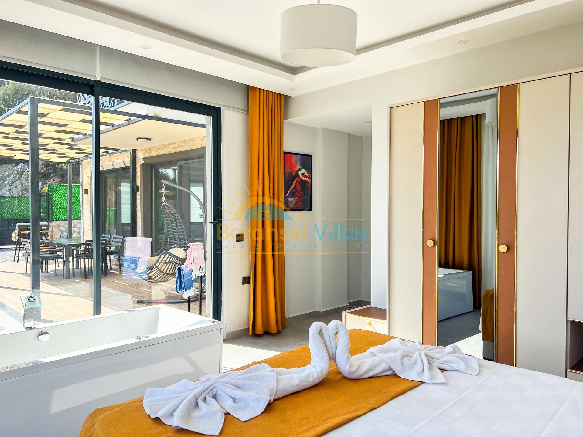 Details: Double bed, wardrobe, air conditioning, jacuzzi, baby cot, access to the pool terrace, and bathroom.