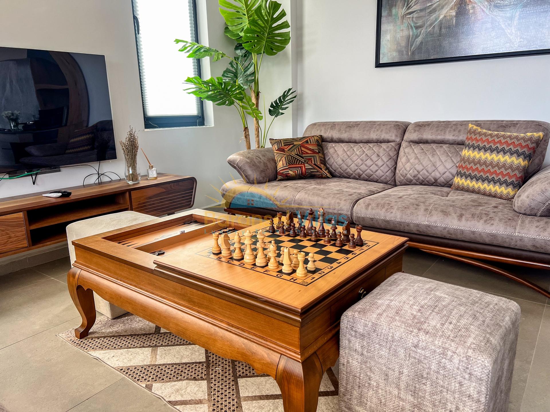 Details: Includes a seating area, satellite TV, a dining table for 6, and access to the pool terrace.
