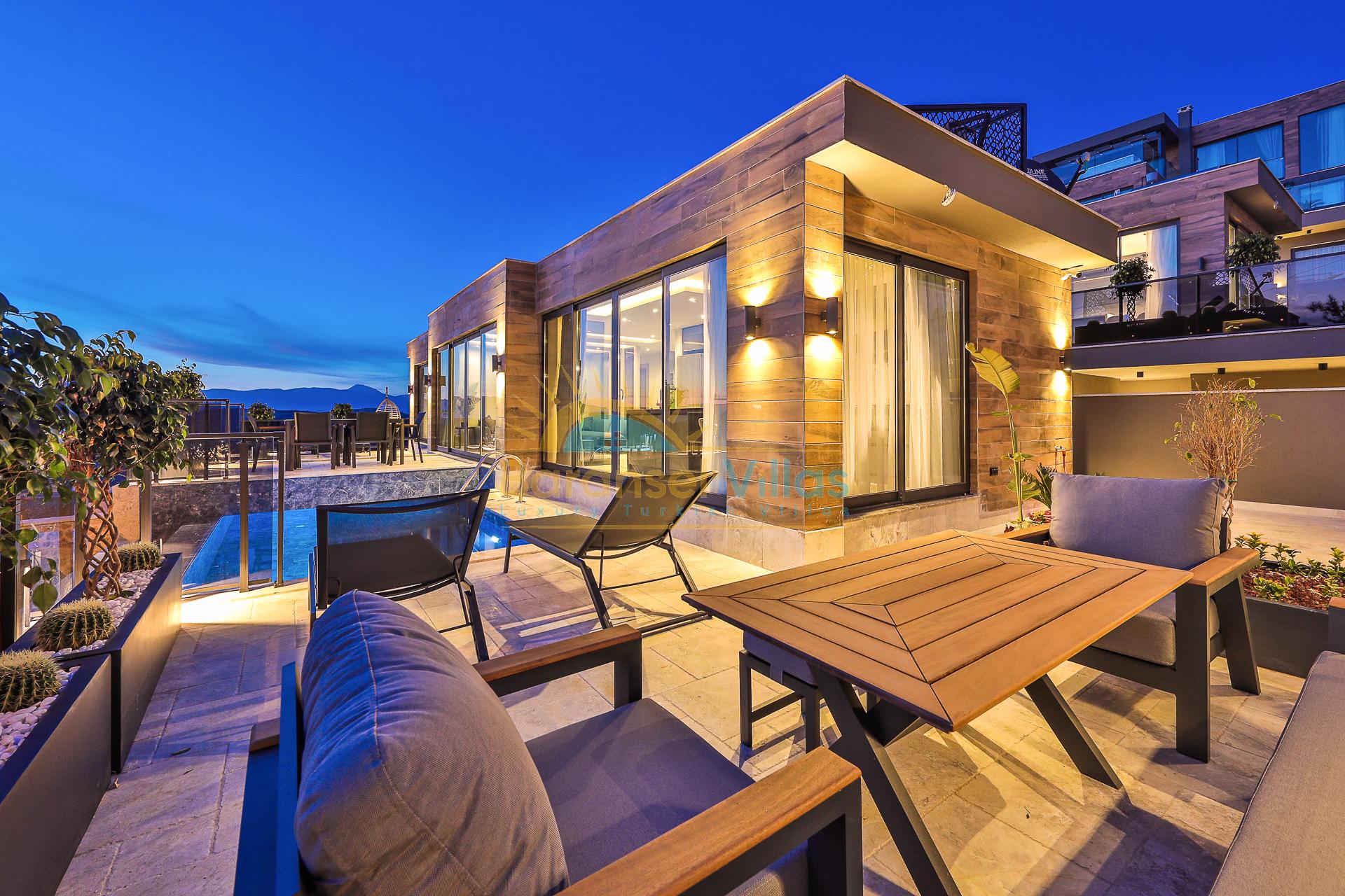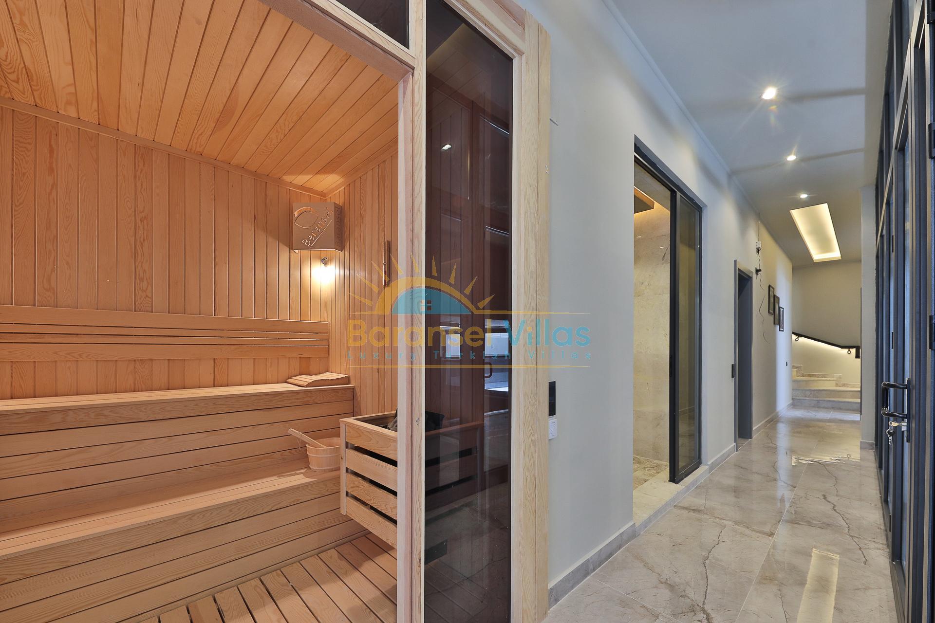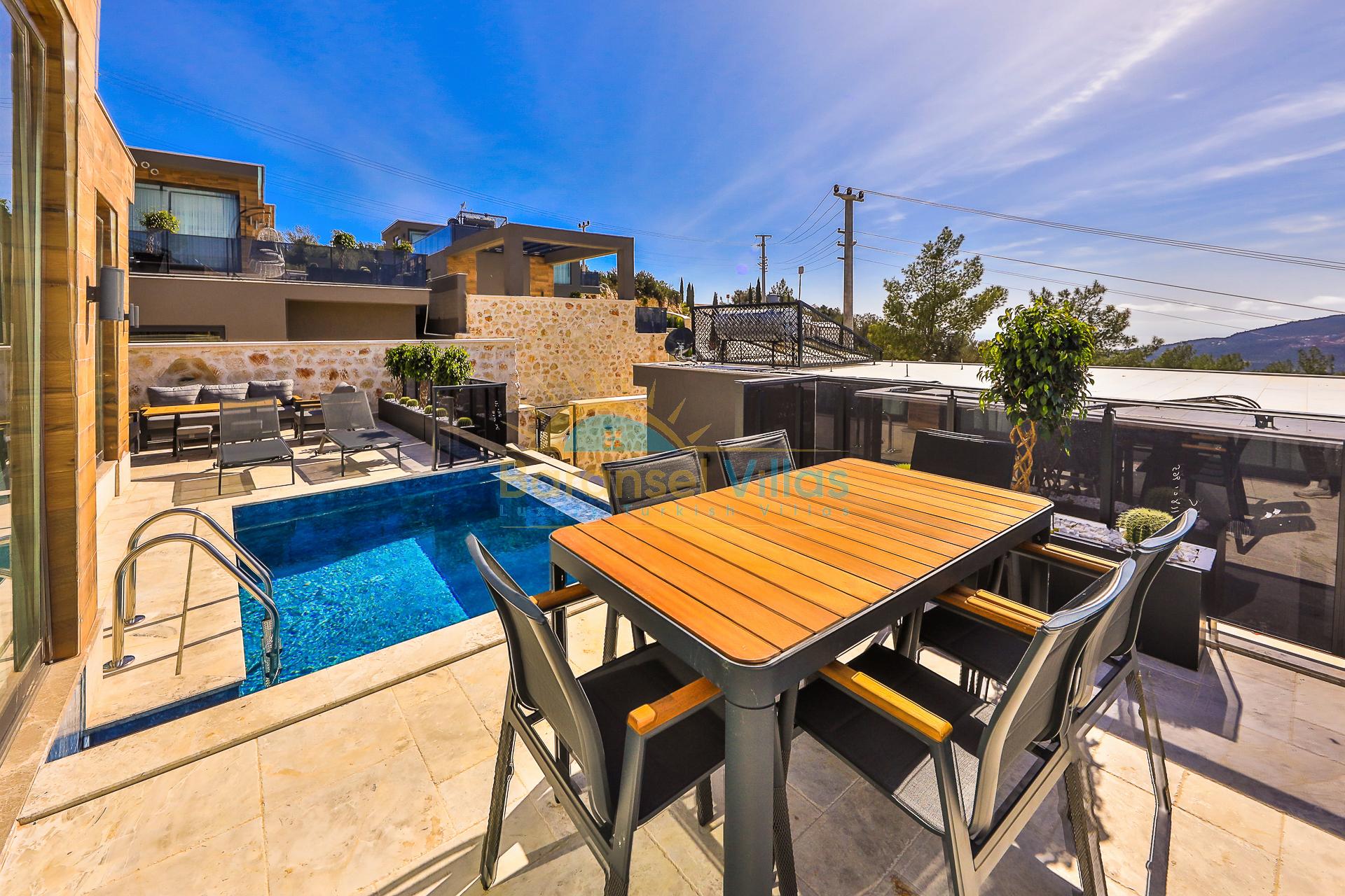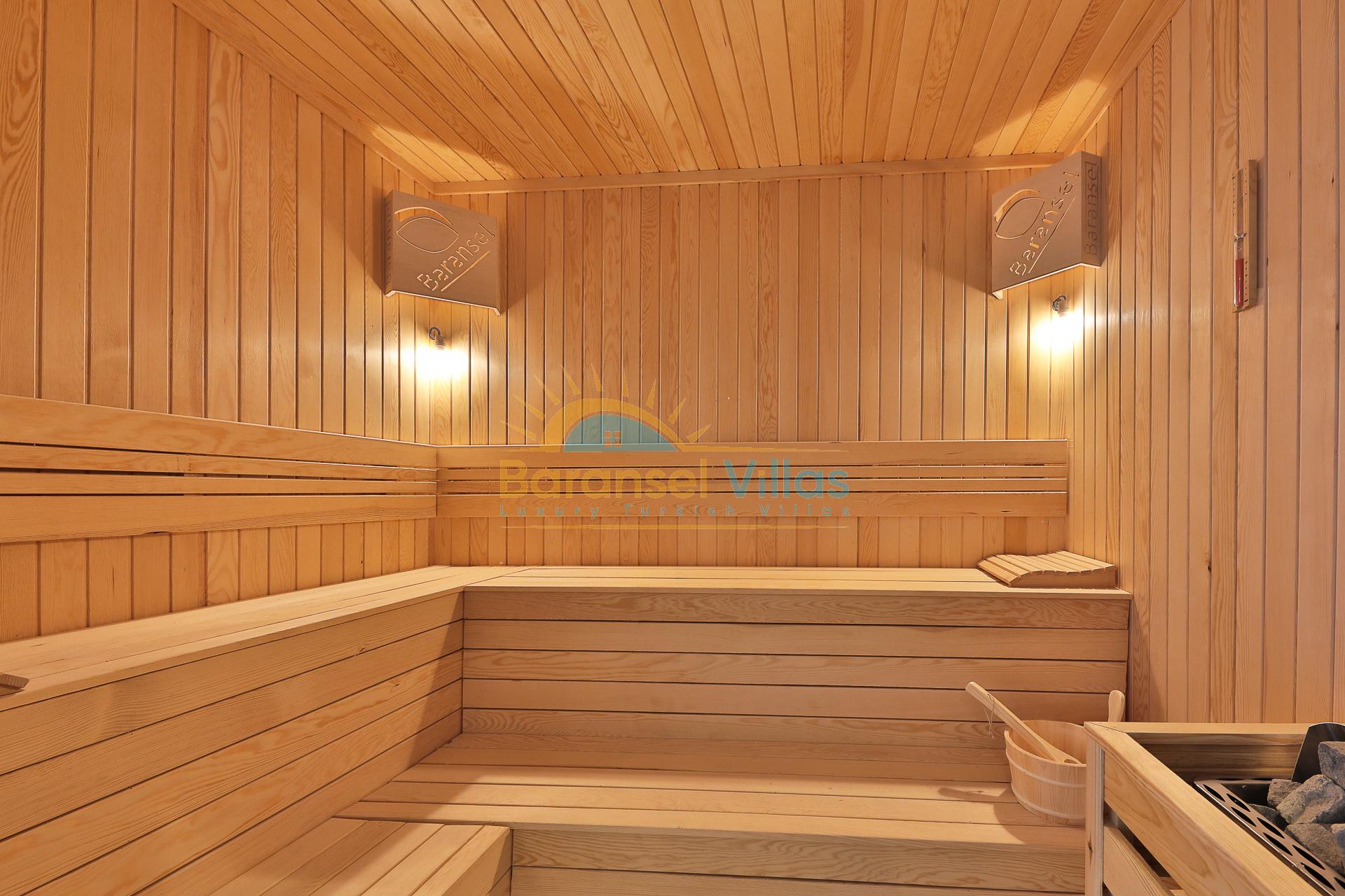 Located in Kalkan’s Incebel region, tucked away between the trees in a peaceful and quiet area is Villa Omega. Consisting of two bedrooms, as well as an open plan living space and outdoor pool terrace. The villa is spread over two floors; where the basement floor of the villa has been designed thoughtfully and not only brings luxury but also entertainment features to the villa. Villa Omega's pool terrace is spacious, and features plenty of spaces for sunbathing as well as dining al fresco. The main living space is found on the ground floor of the villa, where the open plan kitchen living room provides space for family to dine together and cosy up during the winter. Glassed doors have been fitted throughout - giving the villa a light and airy feel, and also allows access to the pool terrace from nearly every angle. A bedroom, fitted with Jacuzzi can be found on this floor also. Located downstairs, on the basement floor of the villa, is a further bedroom as well as the villas main entertainment area. Here a sauna, indoor pool and Turkish bath can all be found.
