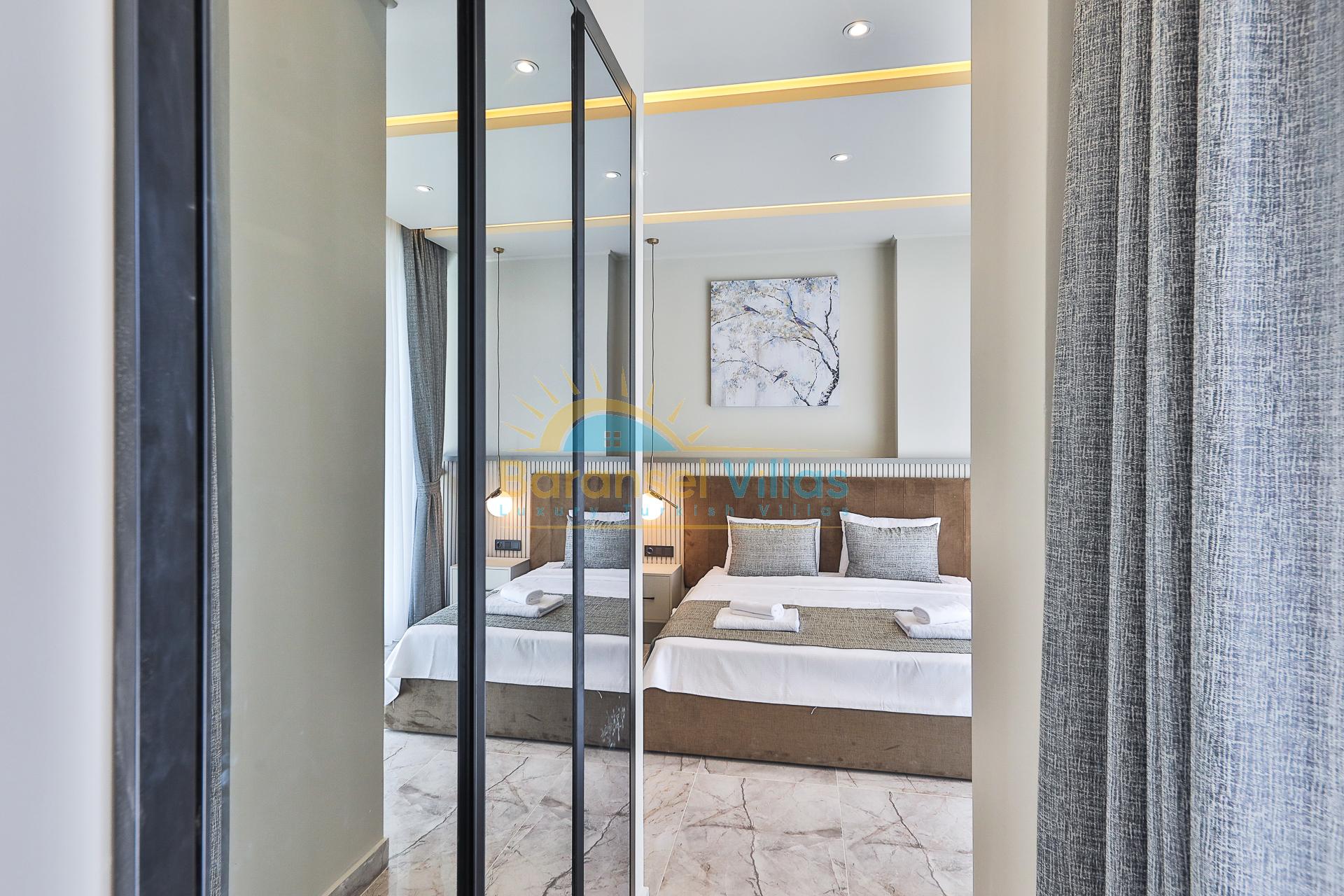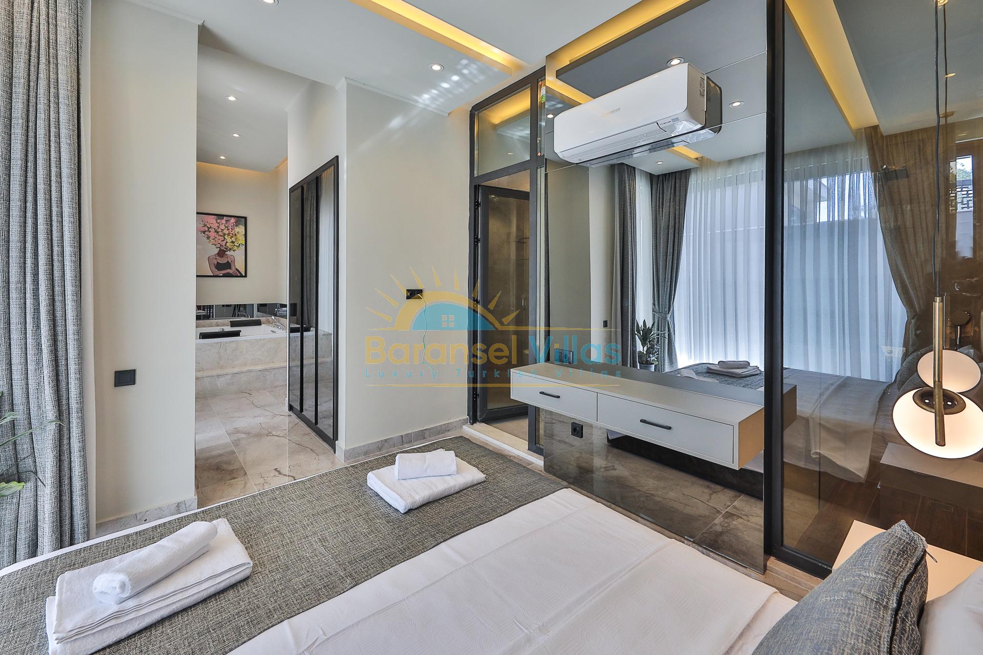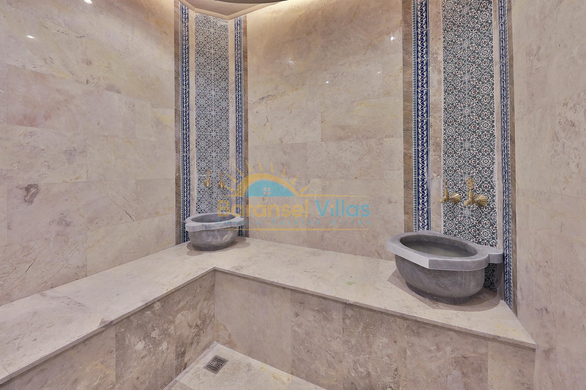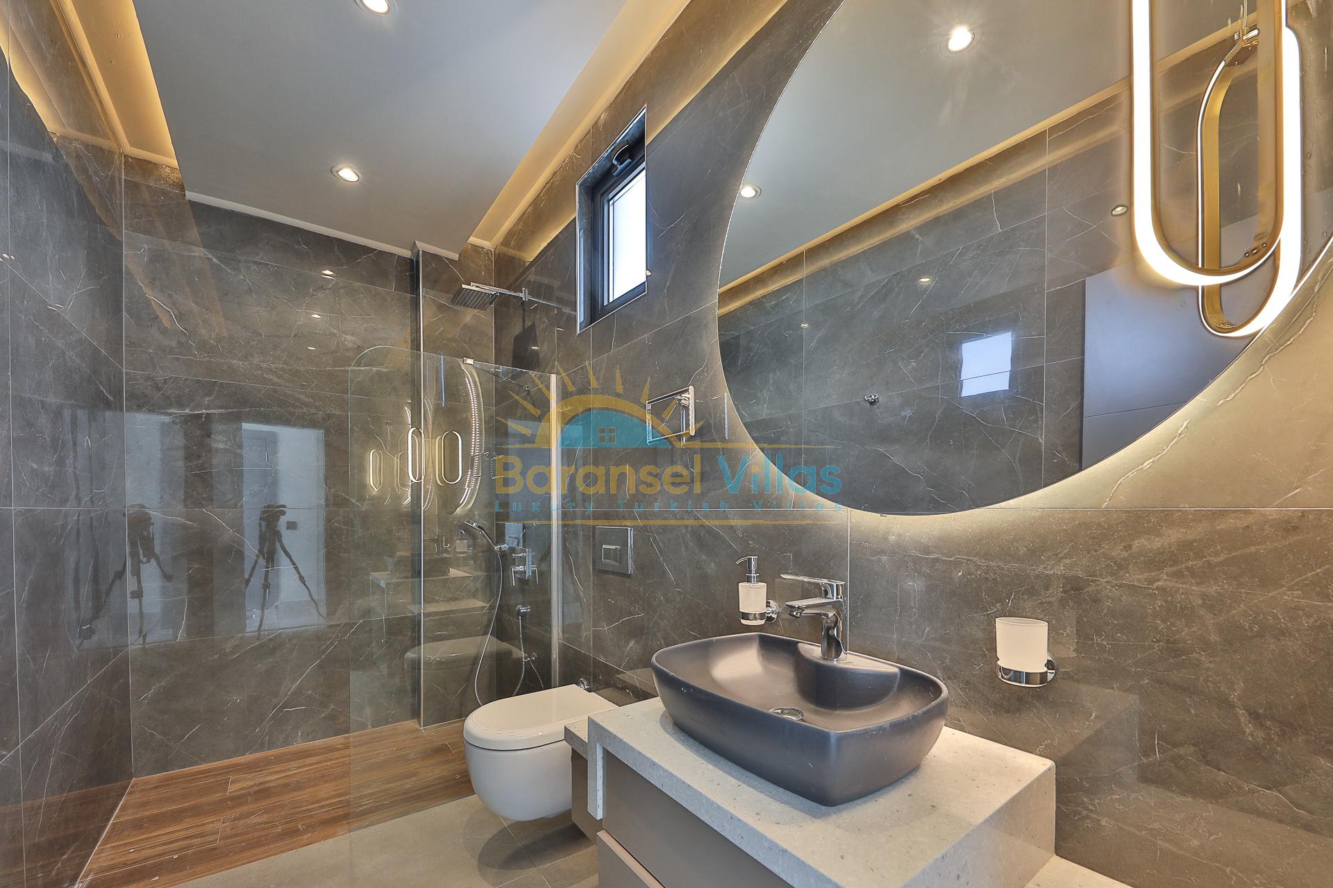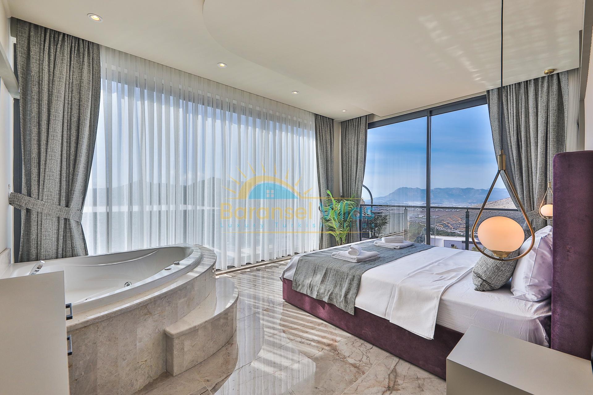 Located in Kalkan’s Incebel region, tucked away between the trees in a peaceful and quiet area is Villa Omega. Consisting of two bedrooms, as well as an open plan living space and outdoor pool terrace. The villa is spread over two floors; where the basement floor of the villa has been designed thoughtfully and not only brings luxury but also entertainment features to the villa. Villa Omega's pool terrace is spacious, and features plenty of spaces for sunbathing as well as dining al fresco. The main living space is found on the ground floor of the villa, where the open plan kitchen living room provides space for family to dine together and cosy up during the winter. Glassed doors have been fitted throughout - giving the villa a light and airy feel, and also allows access to the pool terrace from nearly every angle. A bedroom, fitted with Jacuzzi can be found on this floor also. Located downstairs, on the basement floor of the villa, is a further bedroom as well as the villas main entertainment area. Here a sauna, indoor pool and Turkish bath can all be found.