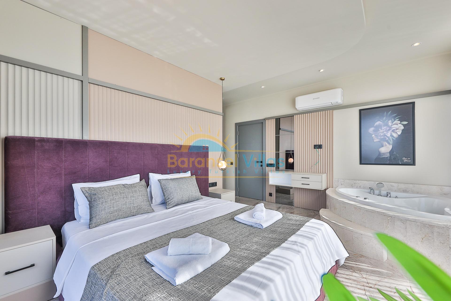Details: Double bed, nightstand, air conditioner, wardrobe, vanity table, baby bed, bathroom, TV, jacuzzi and exit to the pool terrace.