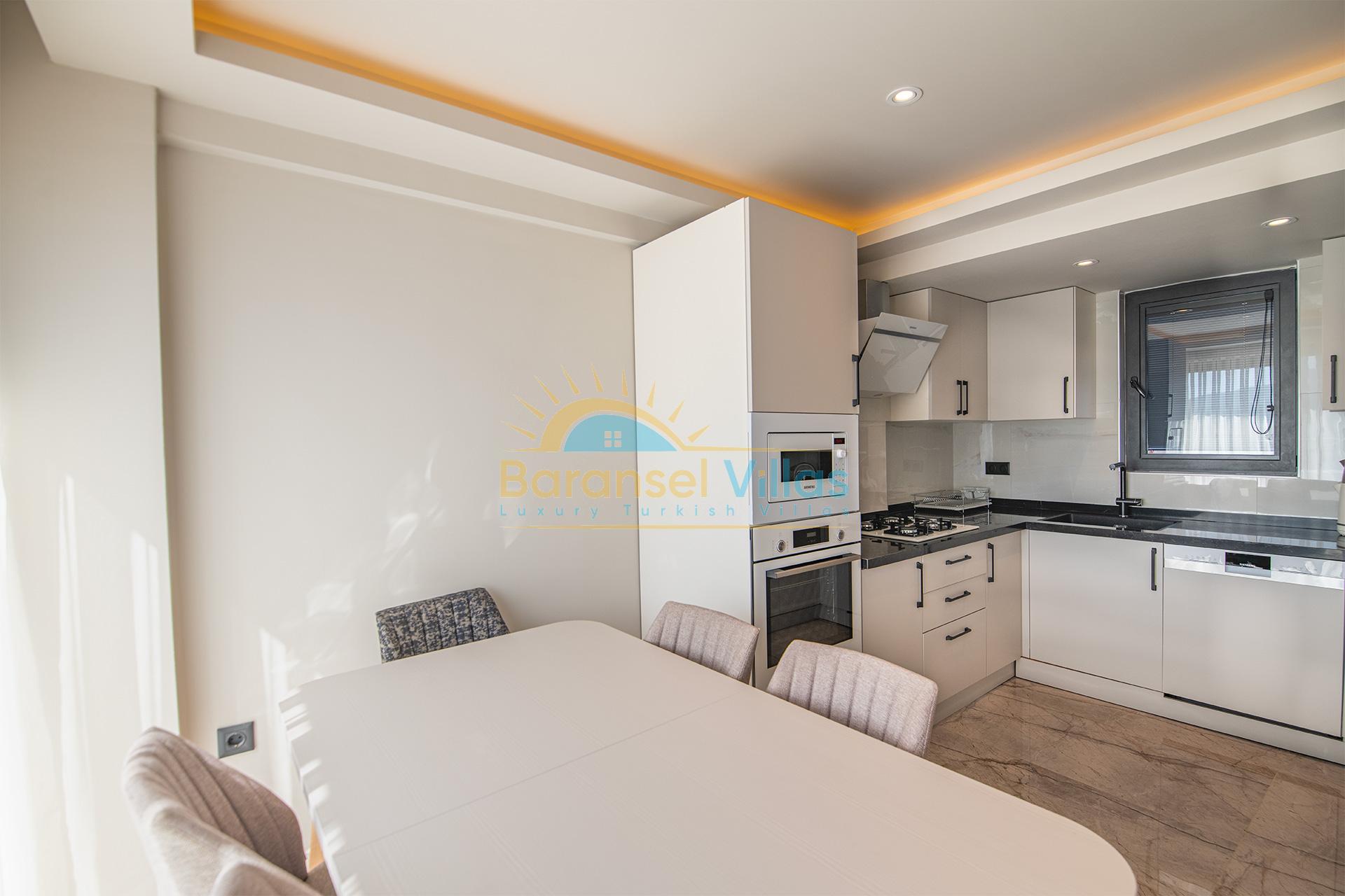 Although it may vary depending on the villa type, BaHisar villas are designed as 4+1 layouts, with the largest consisting of four floors and others of three floors. In the living room, where hidden lighting is used, wooden wall decorations elegantly separate the living and dining areas. The open-plan kitchen is designed in two sections with a central island that accommodates four people. In the bedrooms, headboards are decorated with mirrors and wooden details, creating a stylish and modern atmosphere.